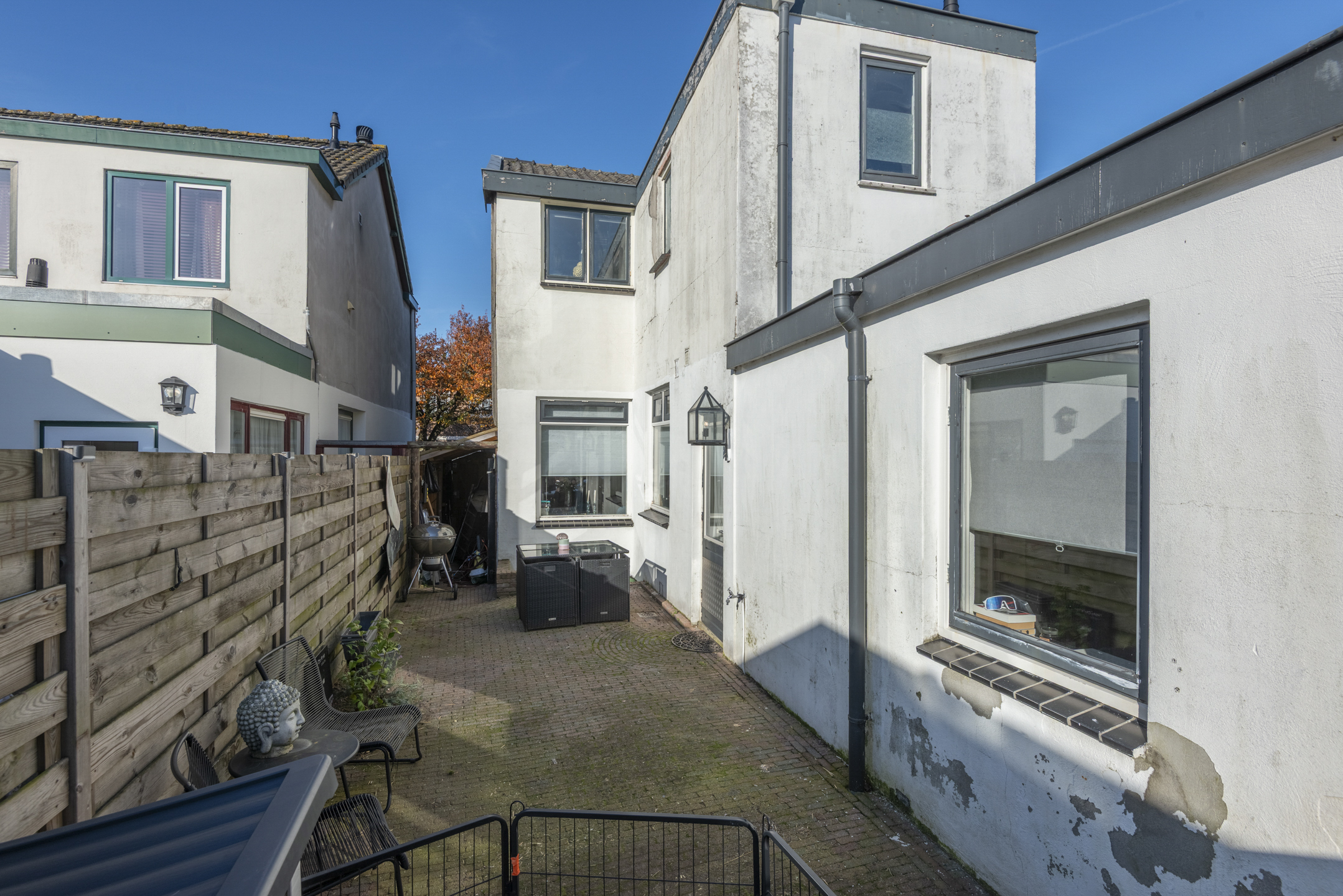 De achtertuin is gesitueerd op het zuidwesten met altijd wel een plekje in de zon of juist in de schaduw te vinden. De tuin is volledig bestraat (onderhoudsvriendelijk) maar voor de mensen met groene vingers nog voldoende mogelijkheden om leuk te beplanten. De tuin wordt begrensd door houten schuttingen en een poort naar de entree aan de zijkant met een overkapping voor stalling van fietsen, kliko’s en dergelijke.