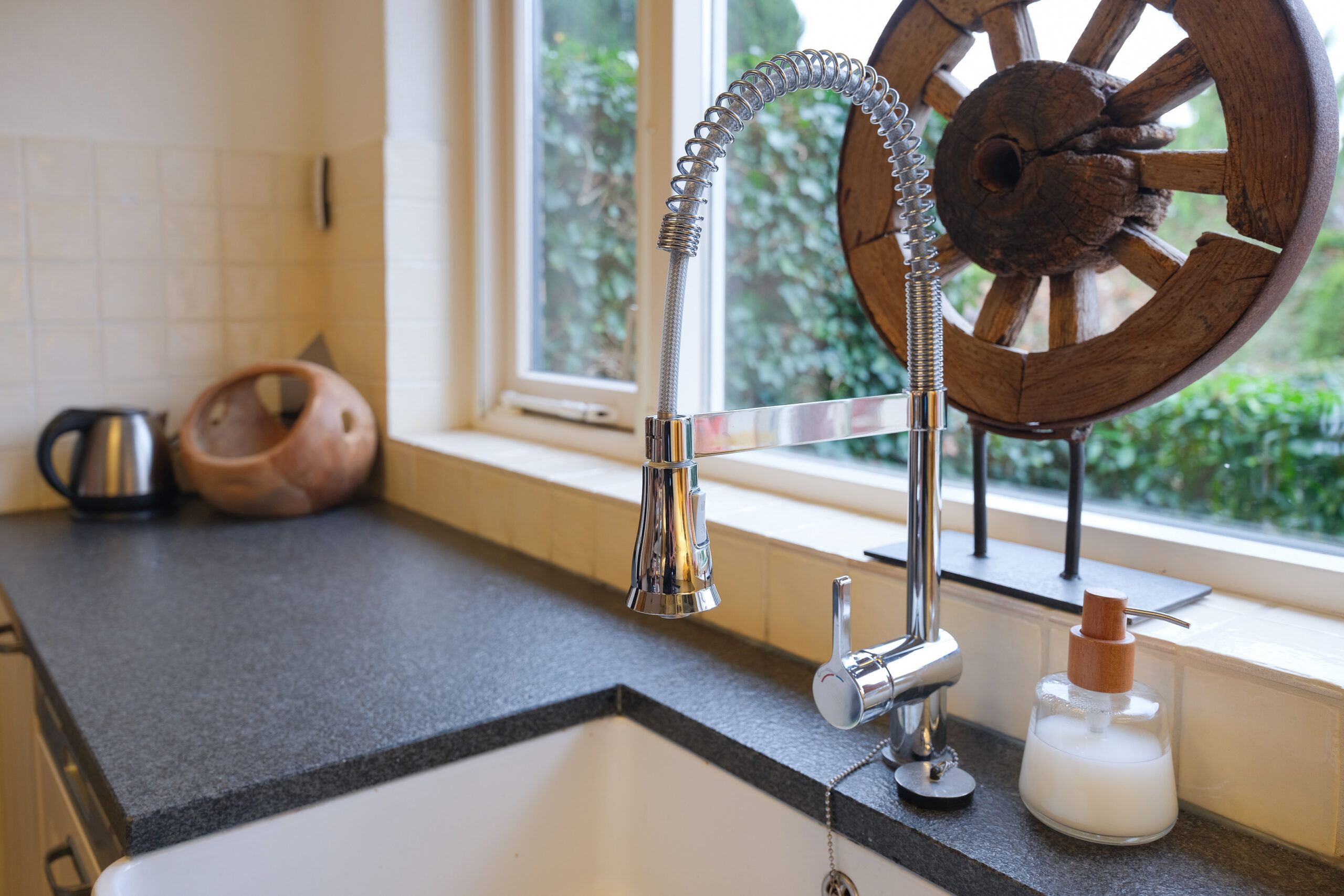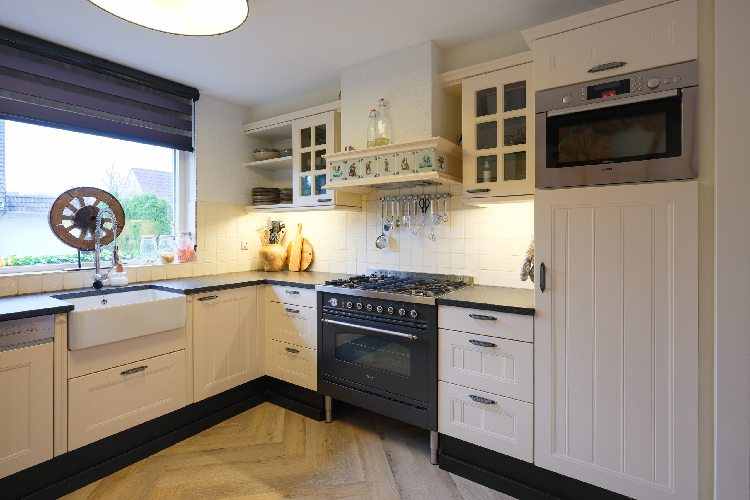 De open keuken ligt aan de voorzijde, in hoekopstelling, heeft een landelijke uitstraling met ruim voldoende kasten en laden voor het opbergen van uw keukengerei. Deze keuken is voorzien van de gangbare inbouwapparatuur, waaronder een combi /magnetron, een 5-pits gastoestel met een elektrische oven (Boretti) en een afzuigkap, vaatwasser, koelkast en kunststof werkbladen.