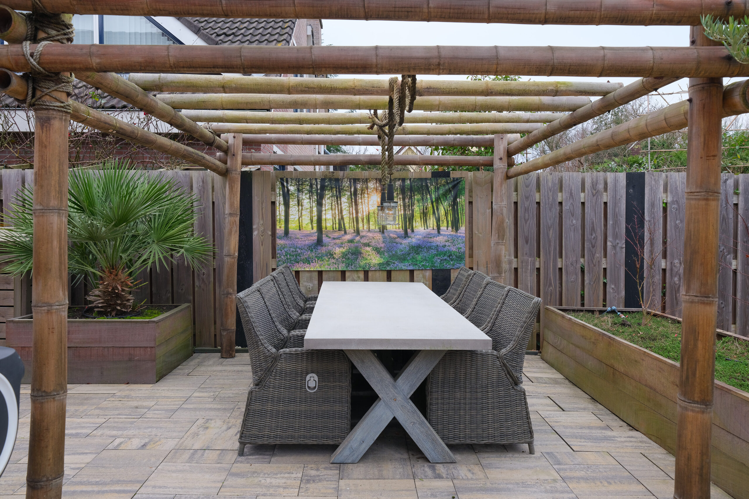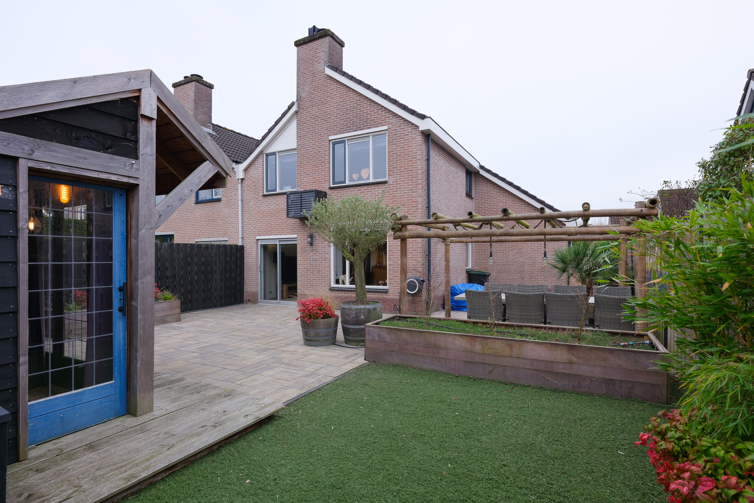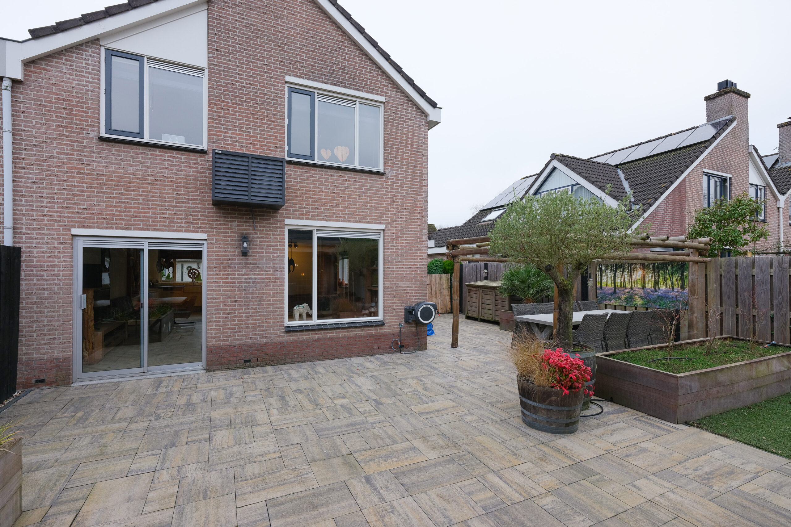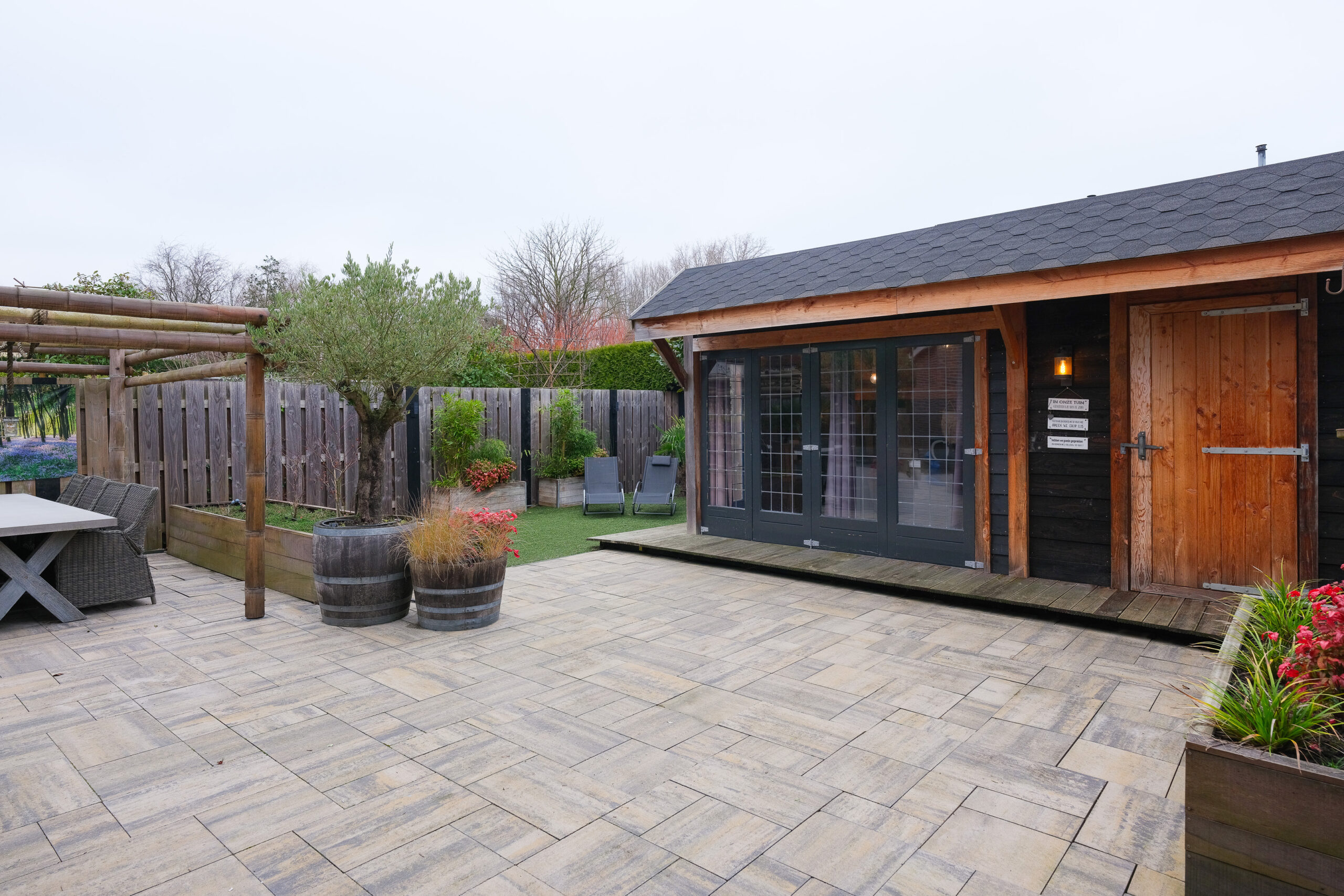 De buitenruimte is eveneens netjes afgewerkt. De achtertuin (noordwesten) heeft een fraaie omheining op de perceelgrenzen en is voldoende diep en breed om op ieder moment van de dag te genieten van de zon of juist even van de schaduw te genieten. Aan de achterzijde wordt de tuin begrensd door overkapping met tuinkamer en een aangebouwde berging. De tuin is grotendeels bestraat maar verrijkt met fraaie “groene” accenten.
