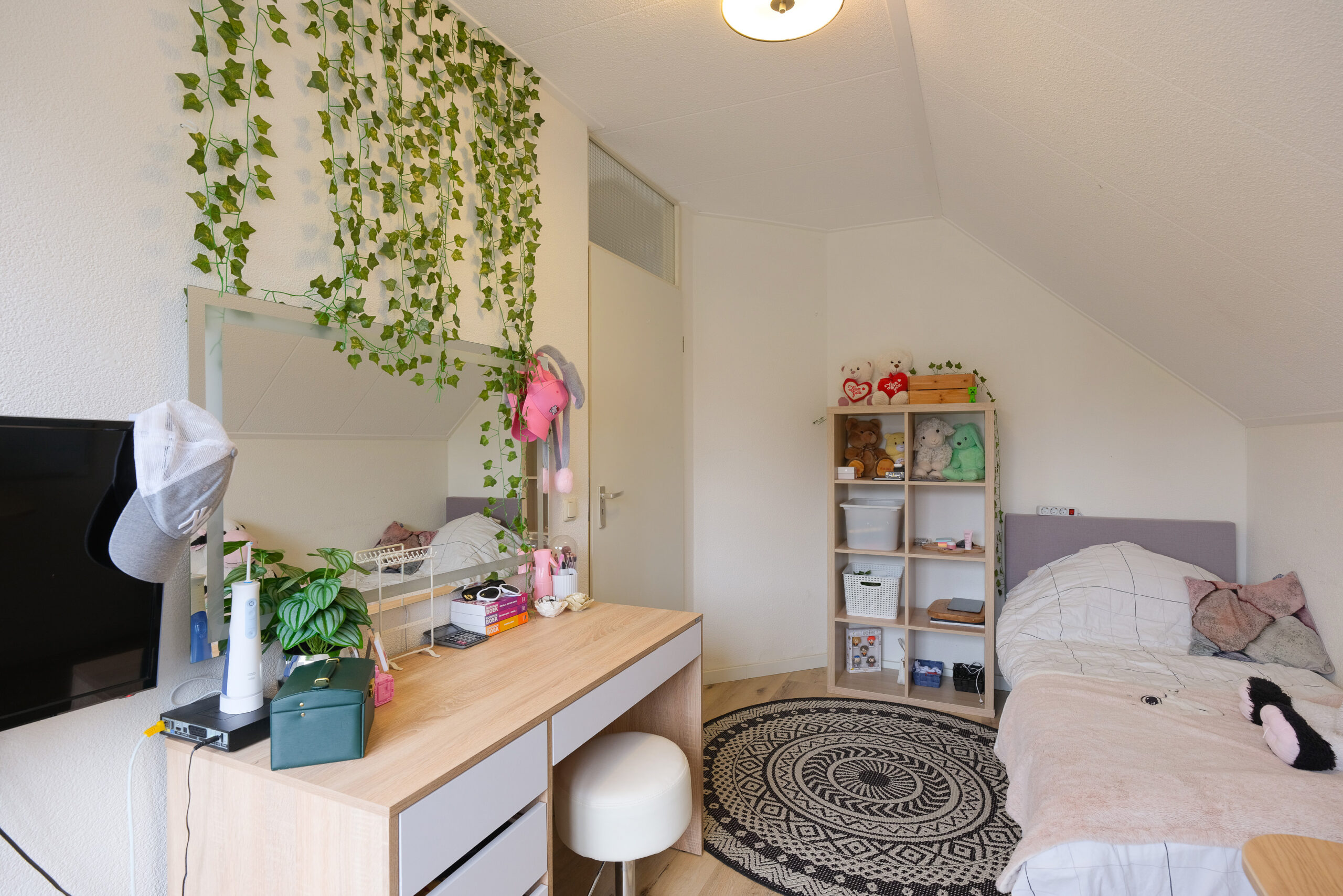 De L- vormige overloop geeft toegang tot vier slaapkamers van goed formaat waarvan 1 met een klein balkon en een goede, moderne badkamer (2024) met inloopdouche, een luxe wastafelmeubel met verwarmde spiegel, 2e vrij hangend toilet, een designradiator en elektrische vloerverwarming. De badkamer is volledig betegeld in fraaie kleurstelling. De drie grootste slaapkamers zijn voorzien van airconditioning. Er is een aparte bergruimte waar de CV-ketel (2021) en mechanische ventilatie unit zijn geïnstalleerd. De gehele vloer van de verdieping is voorzien van een PVC vloer. Vanaf de overloop is via een luik met vlizotrap de bergzolder bereikbaar. Een ideale plaats voor het opbergen van spullen welke u niet dagelijks nodig heeft. De bergzolder loopt over de volledige lengte van het huis, is bijna 4 meter breed en heeft een nokhoogte van 1,22 meter.