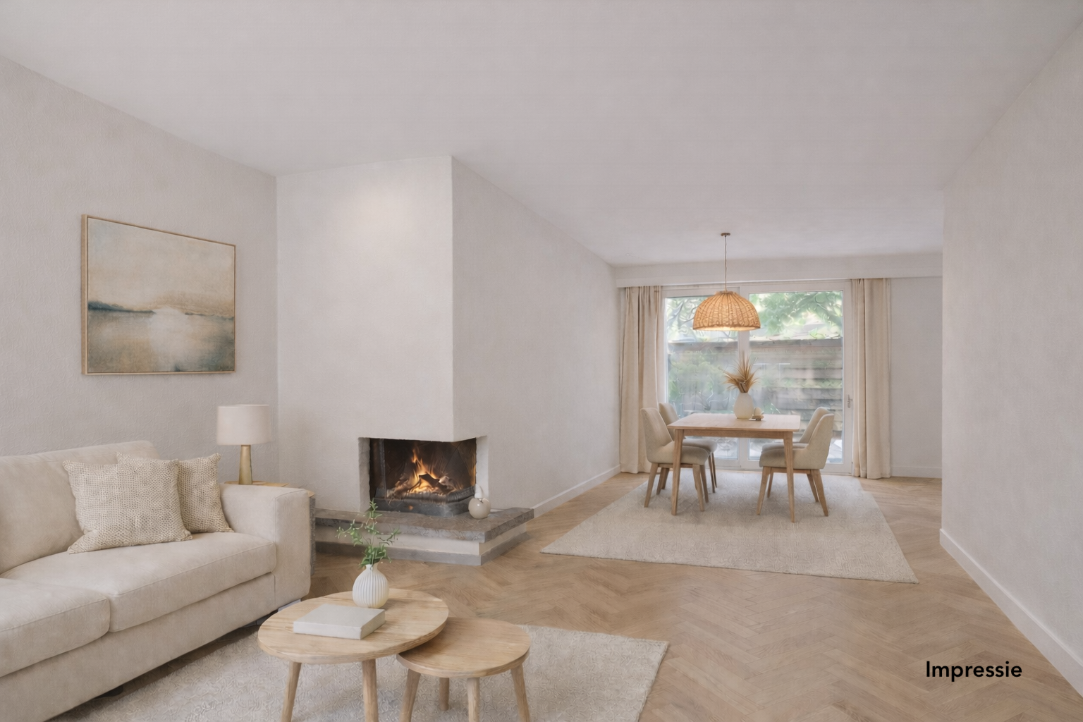 De entree/hal met meterkast, trapkast en garderobekast en toiletruimte geeft toegang tot de speels gebouwde zitkamer met een open haard die naadloos overloopt in de eetkamer welke over de volle breedte van de woning strekt. Vanuit de eetkamer is er middels openslaande deuren toegang tot de achtergelegen tuin. De wanden zijn van structuurverf voorzien, het plafond is gestuct. De keuken in hoekopstelling heeft een open verbinding met de eetkamer, zo is er altijd contact met uw gasten mogelijk.
